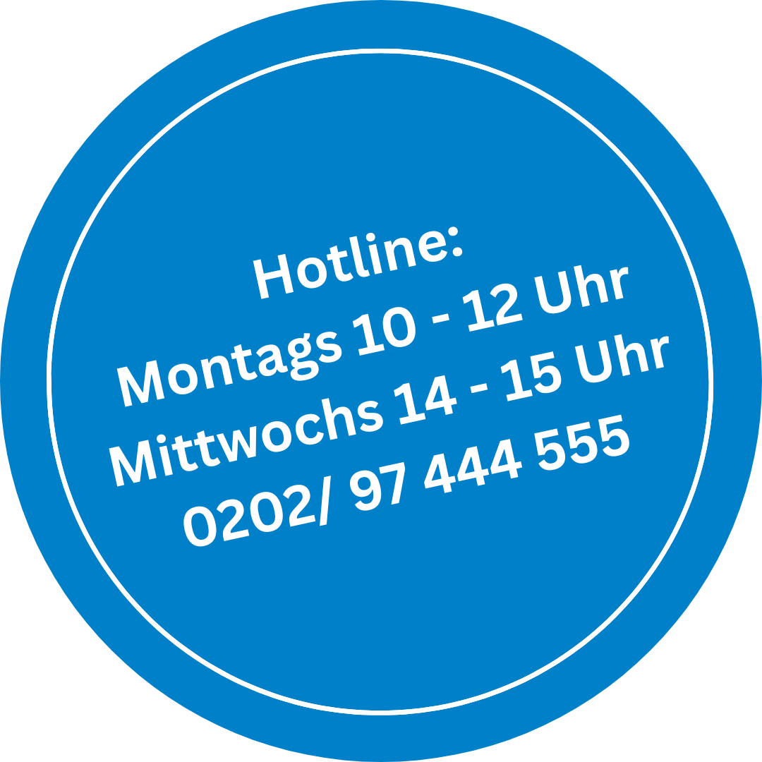 Sie erreichen unsere Hotline montags in der Zeit von 10.00 - 12.00 Uhr unter der Telefonnummer 0202 / 97 444 555.