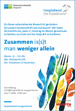 Anmeldungunter Telefon 0202 / 4305 124 oder per Mail hospizdienst@diakonie-wuppertal.de Alle sind willkommen. Das Angebot ist kostenfrei.